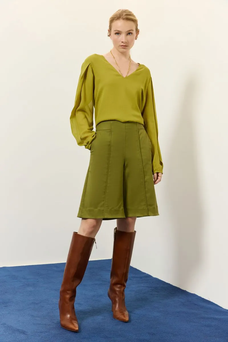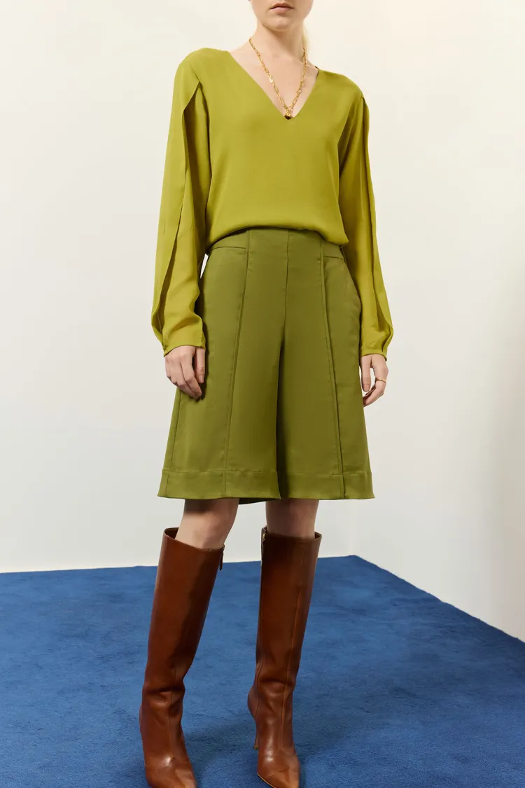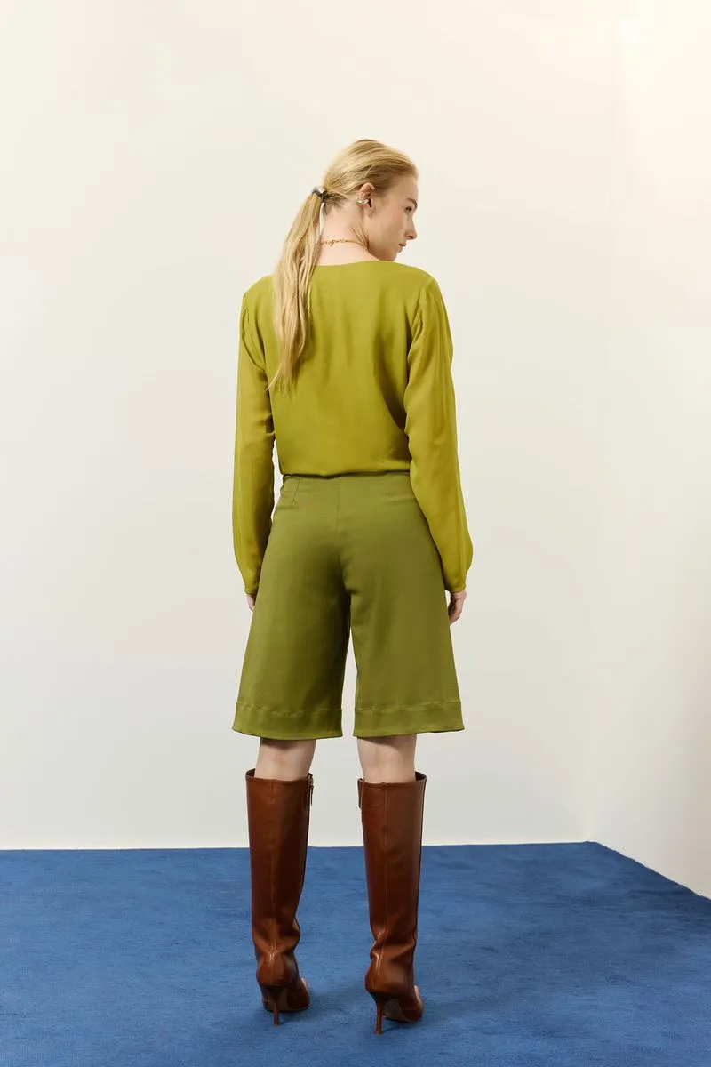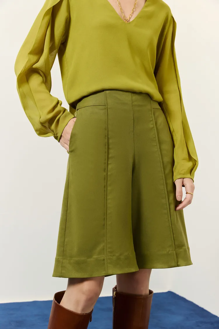 Bermuda de tecido plano em alfaiataria com elastano, modelagem reta, bolso lateral, detalhe de vivo e fechamento lateral por zíper invisível.
