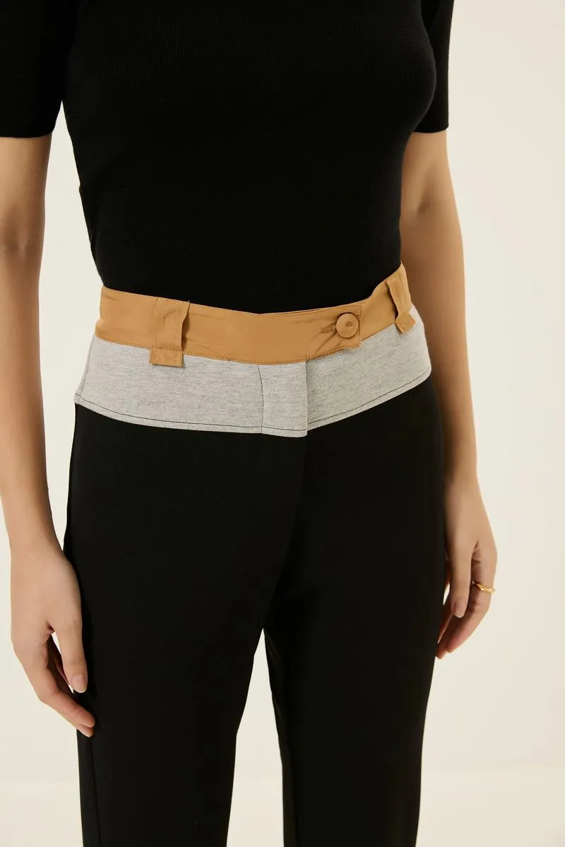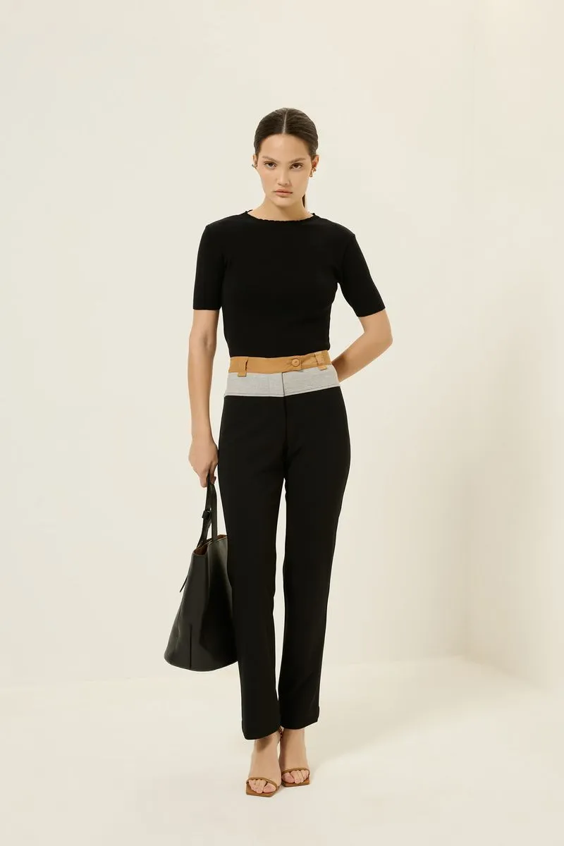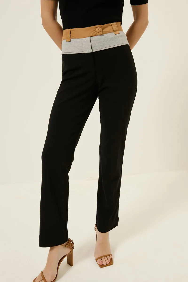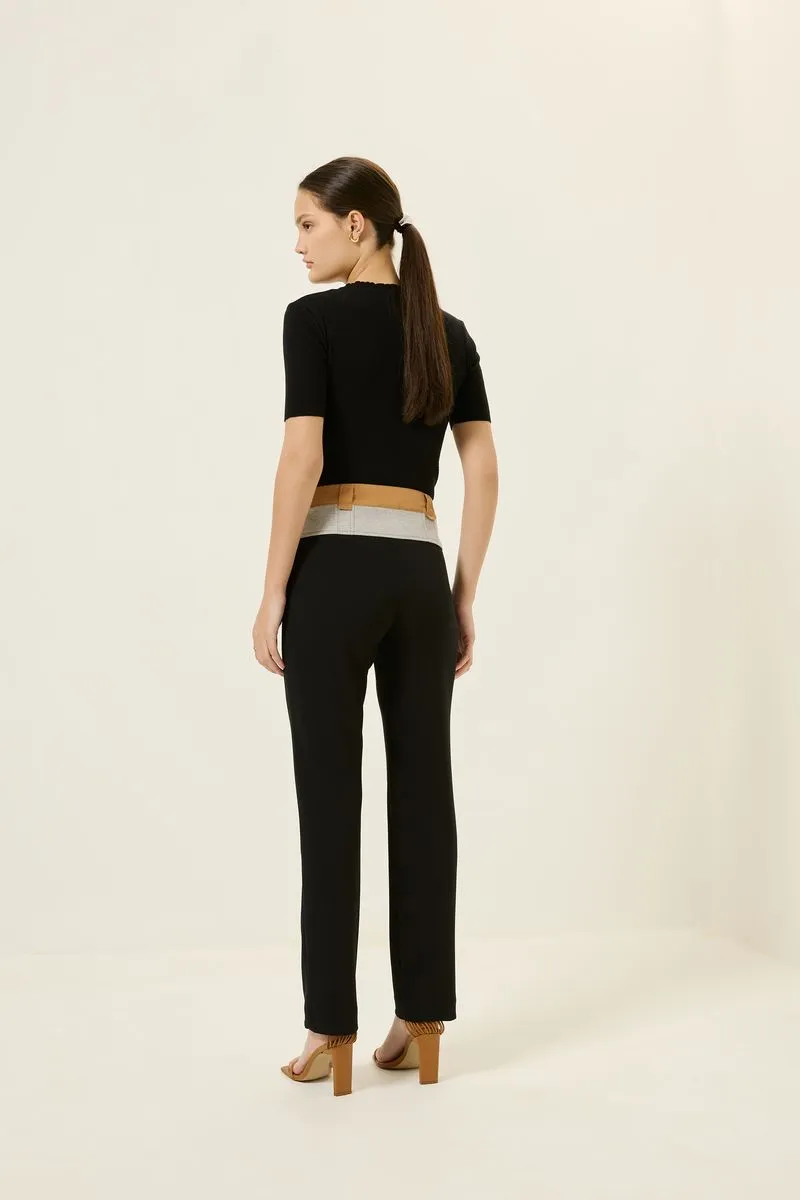 Calça em malha crepe tecnológica estruturada com detalhe pala em malha dublada mescla e cós em nylon, modelagem reta, recorte frente e costas, e fechamento em zíper e botão.
