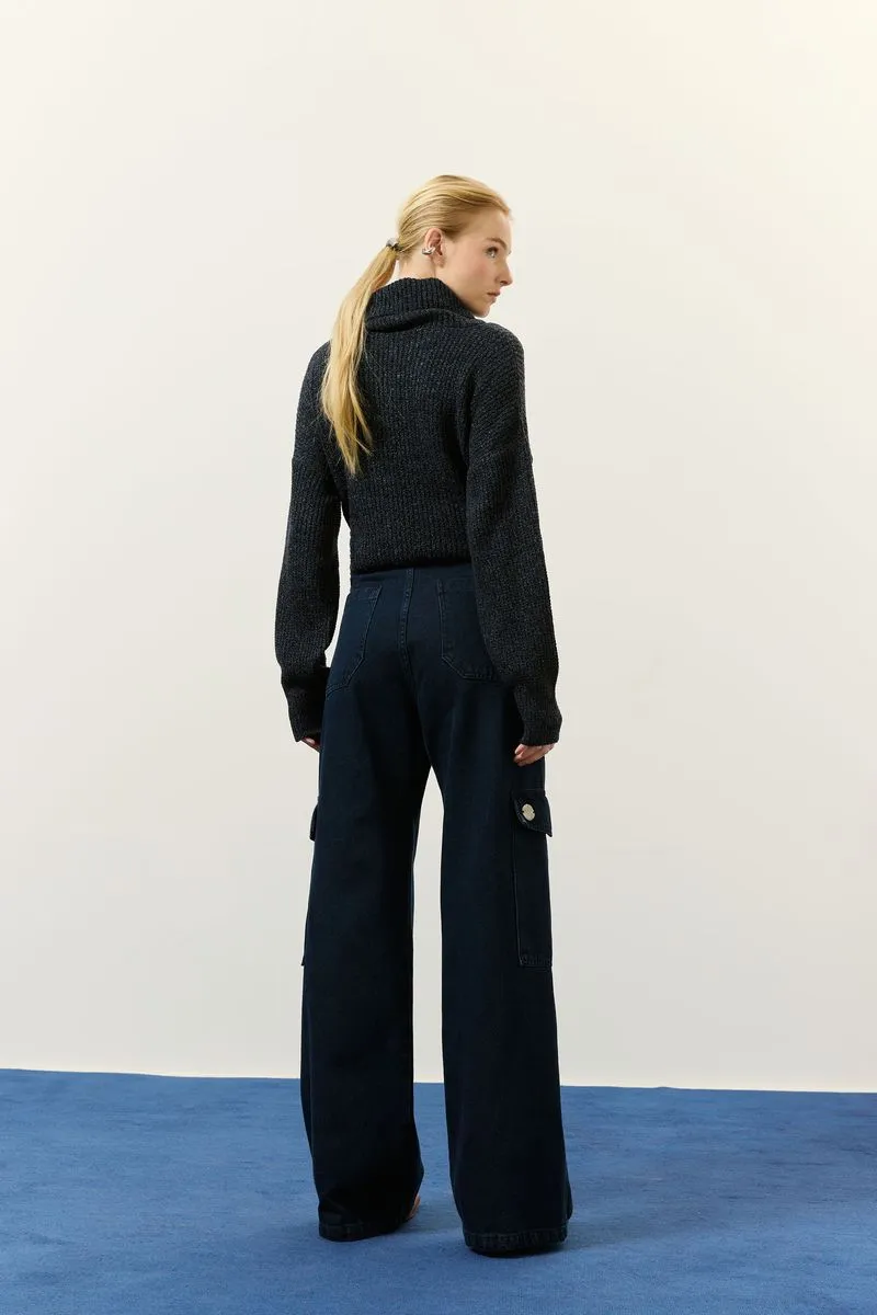 Calça jeans em algodão, modelo pantalona com bolso cargo e detalhe de metal na tampa, bolso lateral e posterior, passadores e fechamento por zíper e botão.