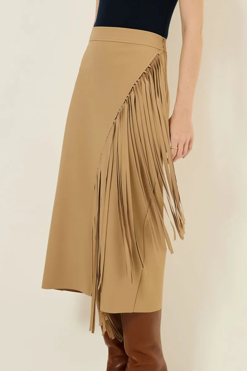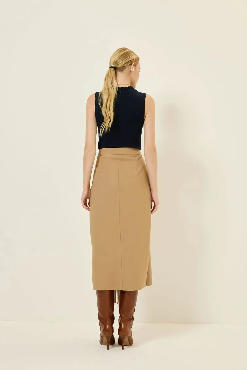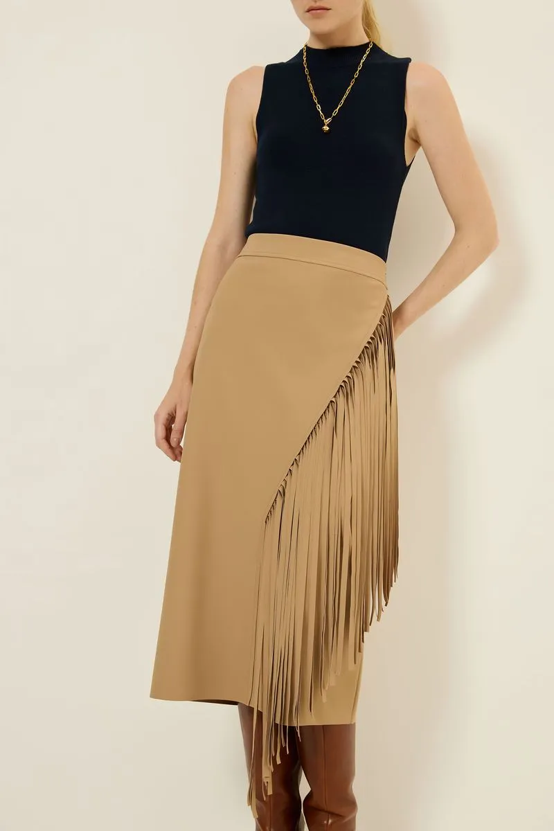 Saia em tecido inteligente, maleável, com toque macio, não marca e oferece conforto, modelagem tubinho, detalhe recorte assimétrico com franja frontal, comprimento midi e fechamento em zíper lateral